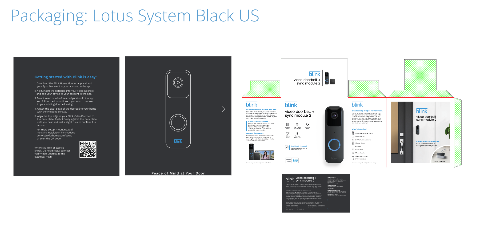 I worked with the creative director to design and edit packaging for the blink video doorbell. This included outer sleeve, box packaging, interior information, photo editing, and icon design.