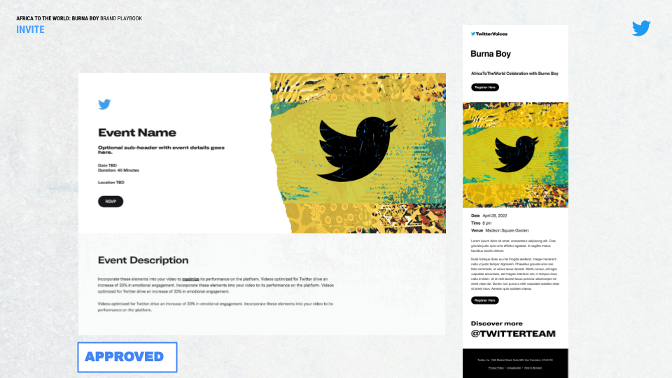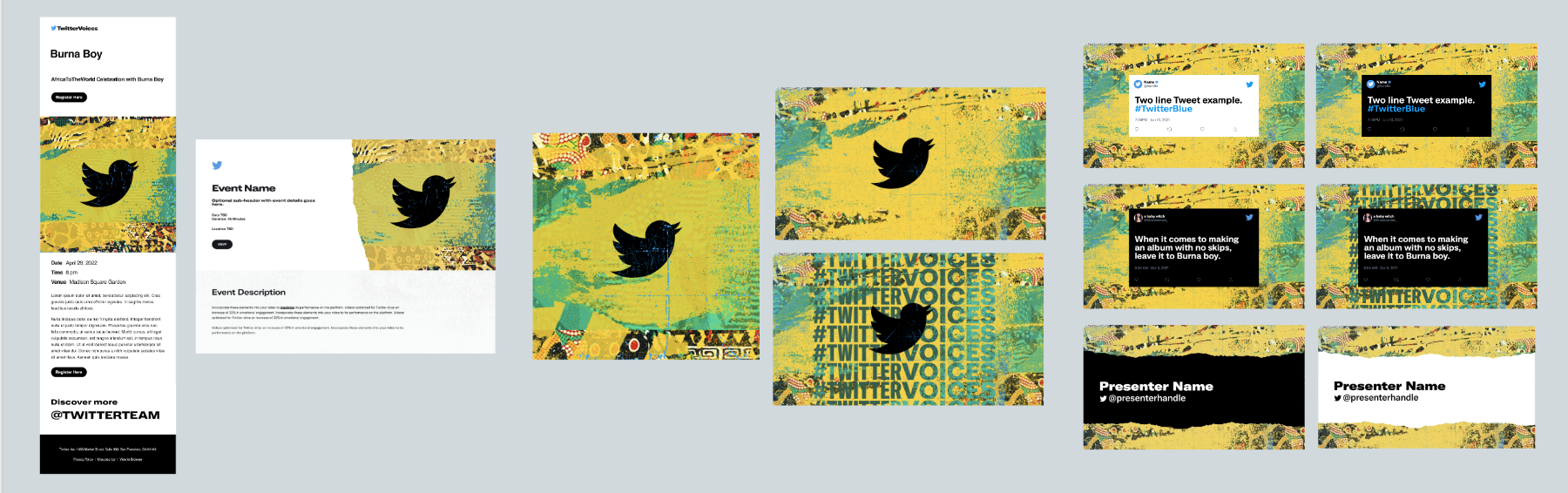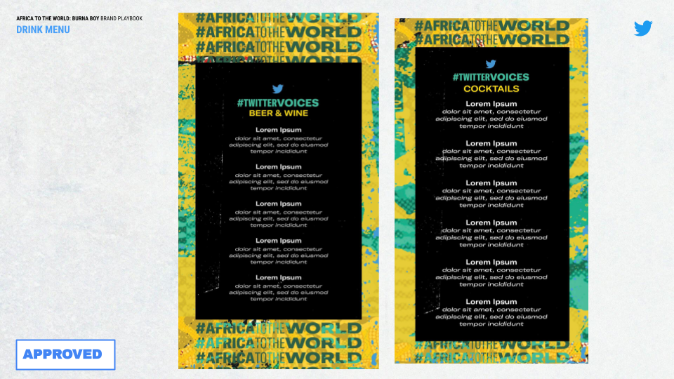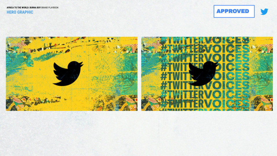With #TwitterVoices, I designed digital and print materials for the event “Africa to the World: Burna Boy.” This event celebrated the Nigerian Grammy-winning artist Burna Boy aka THE AFRICAN GIANT aka ODG aka EL MEJOR aka BIG 7. TwitterVoices is an official Twitter community with initiatives centered around “pushing the conversation forward.” The group was formerly powered by the Culture and Community team at @Twitter.